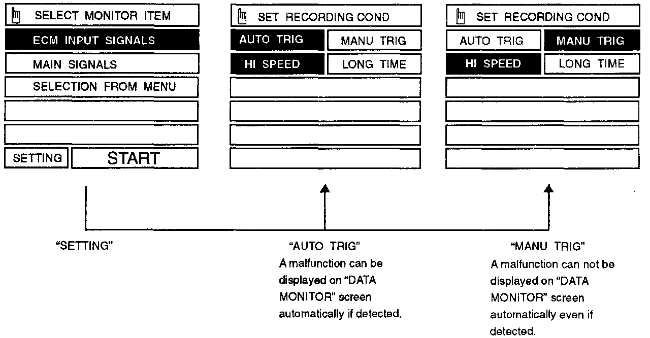 REAL TIME DIAGNOSIS IN DATA MONITOR MODE (RECORDING VEHICLE DATA)CONSULT has two kinds of triggers and they can be selected by touching "SETTING" in "DATA MONITOR" mode.