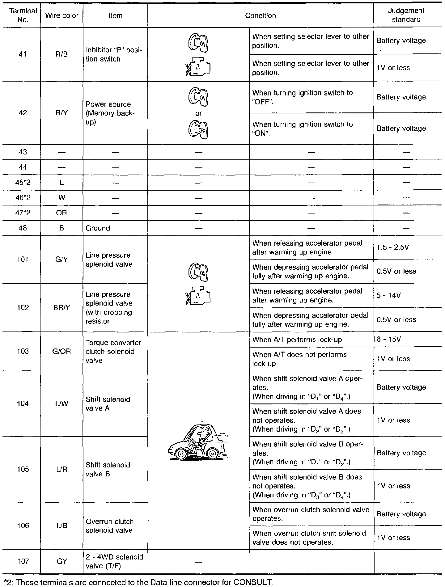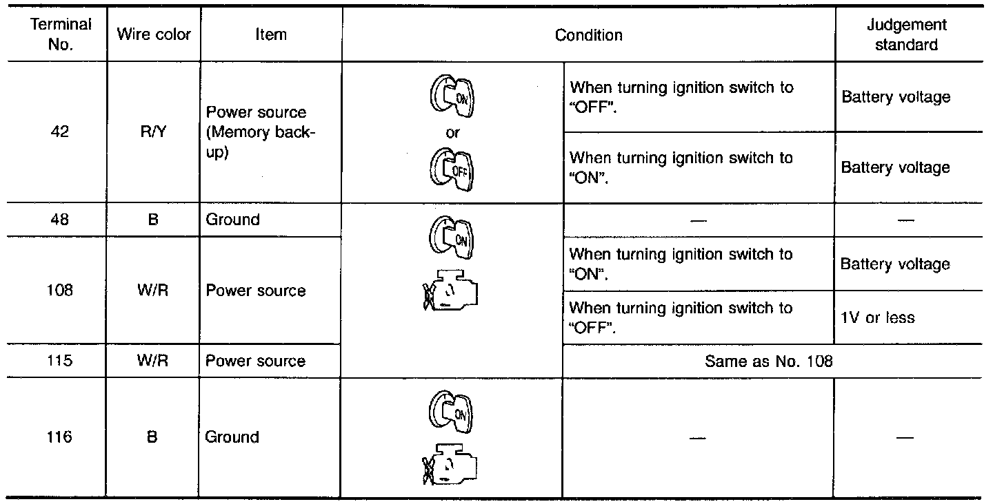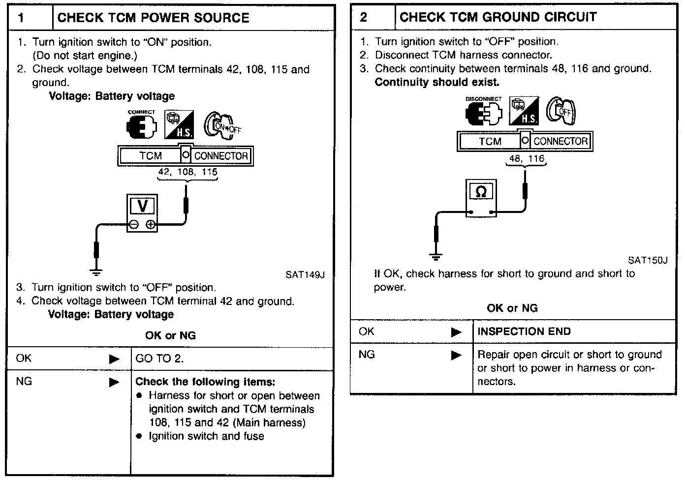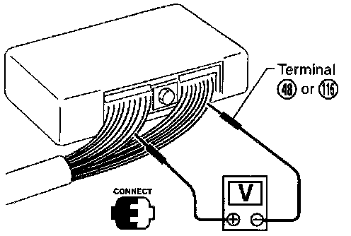 - Measure voltage between each terminal and terminal 48 or 116 by following "TCM INSPECTION TABLE".