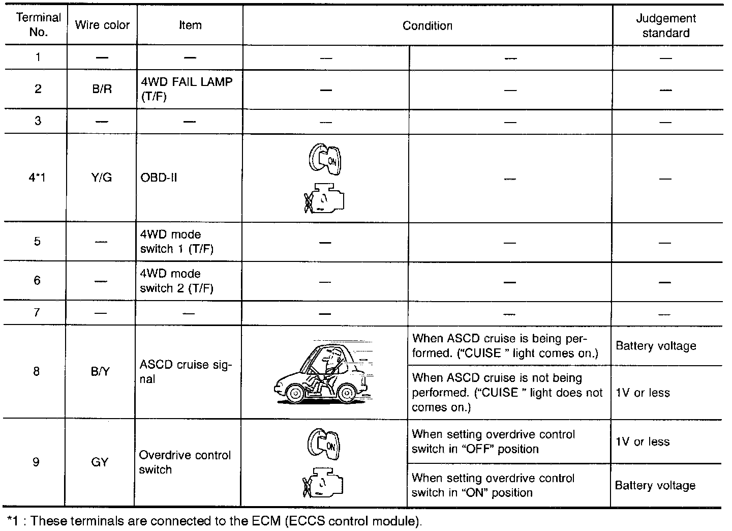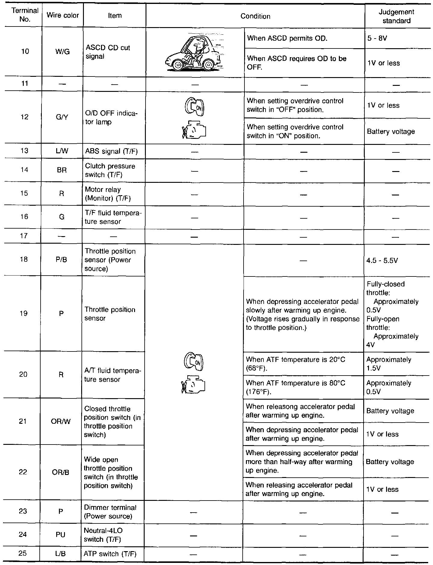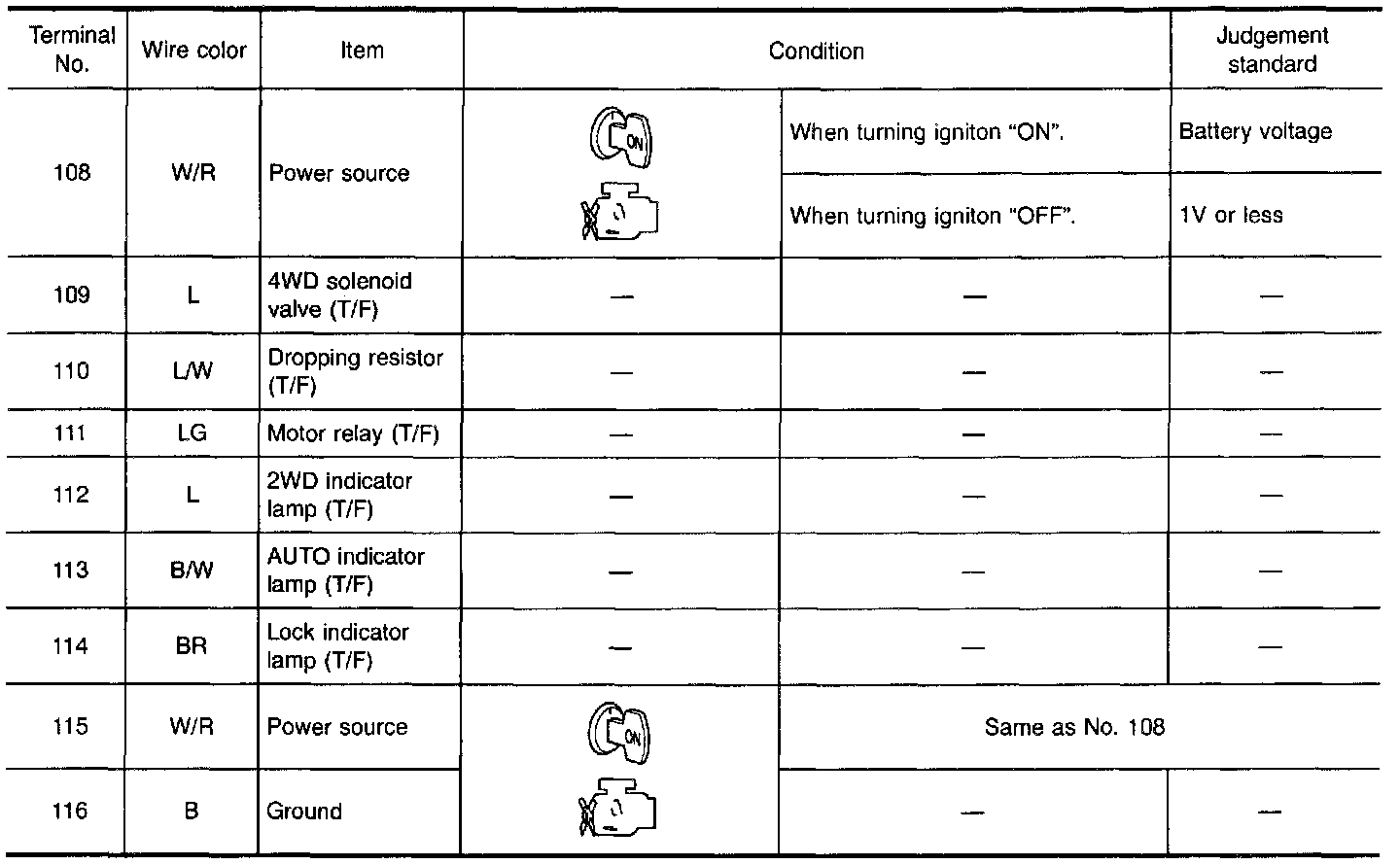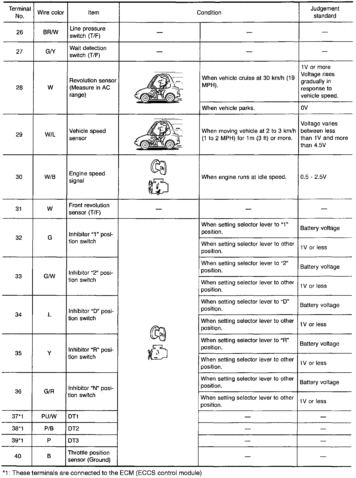 - Measure voltage between each terminal and terminal 48 or 116 by following "TCM INSPECTION TABLE".