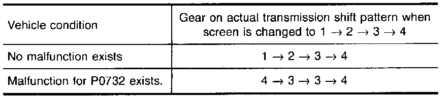 - If "TESTING" does not appear on CONSULT for a long time, select "SELF-DIAG RESULTS" for "ENGINE". In case a 1st trip DTC other than P0732 is shown, refer to applicable "TROUBLE DIAGNOSIS FOR DTC".