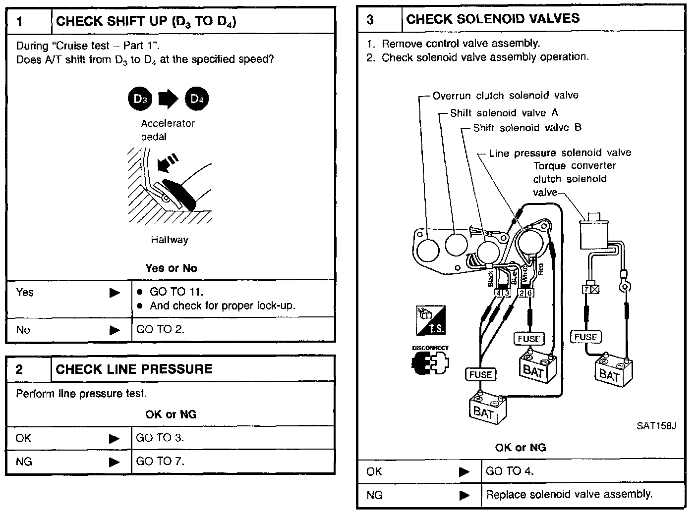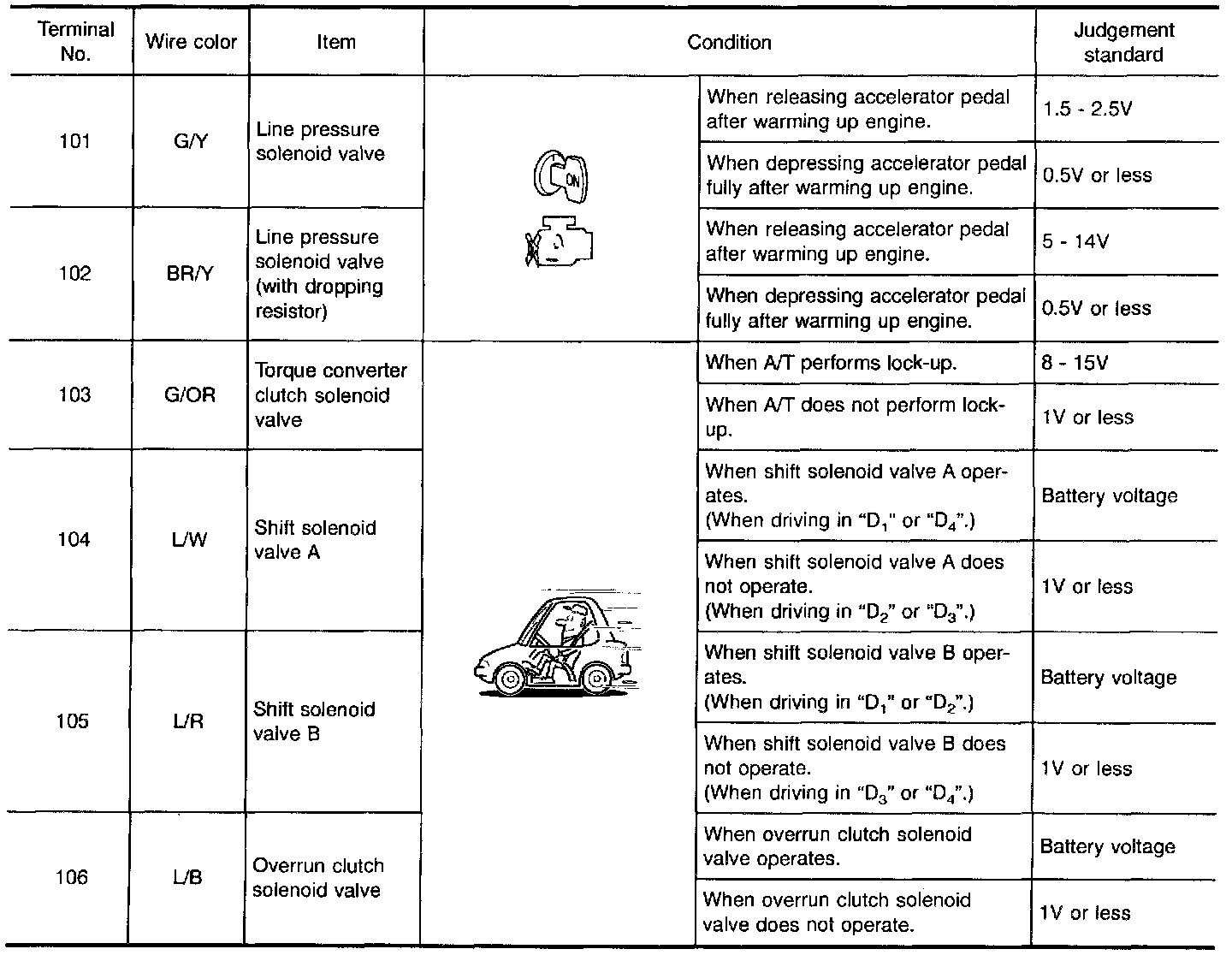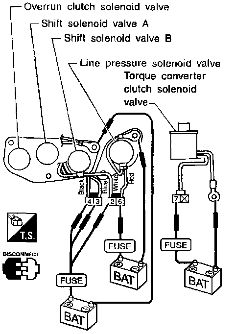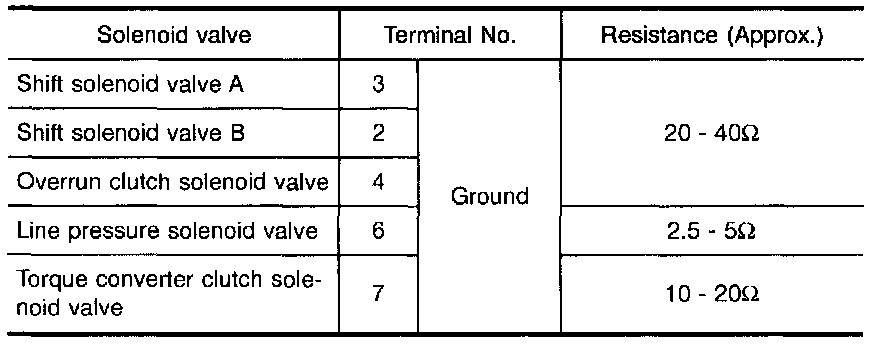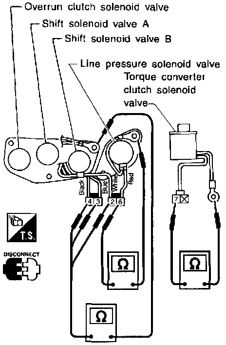 - Check solenoid valve by listening for its operating sound while applying battery voltage to the terminals (3, 2, 4, 6 or 7. and ground.