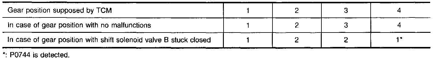If the actual gear position is much lower than the position (4th) supposed by TCM, the slip ratio will be much less than normal. In case the ratio does not reach the specified value, TCM judges this diagnosis malfunction.