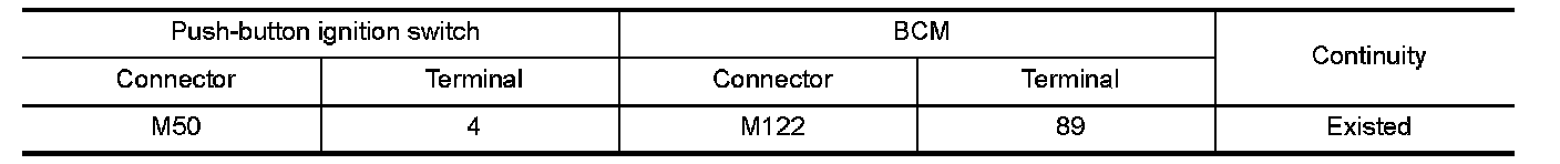 2. Check continuity between push-button ignition switch harness connector and BCM harness connector.
