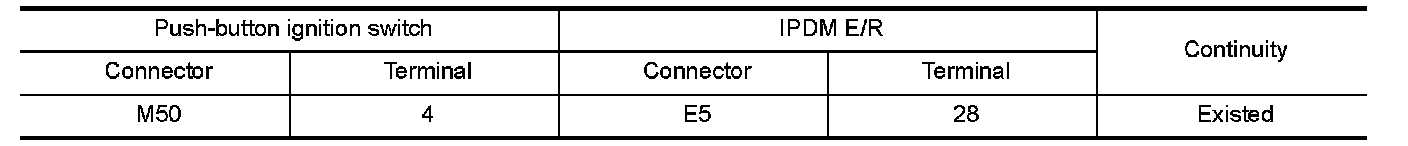 2. Check continuity between push-button ignition switch harness connector and IPDM E/R harness connector.