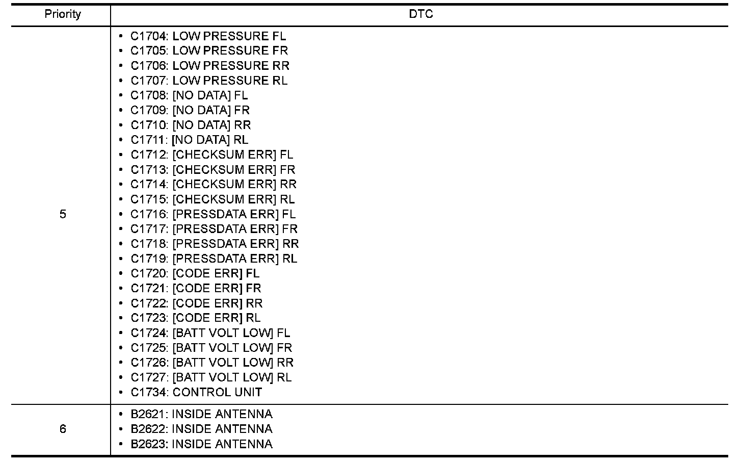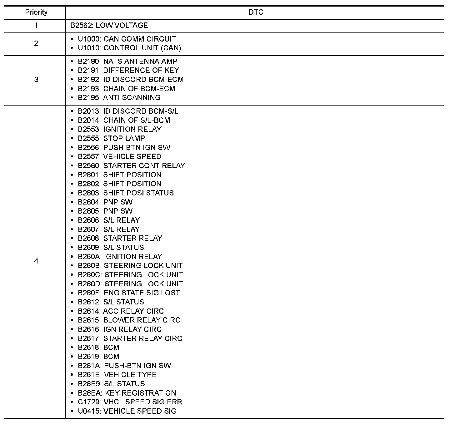 If some DTCs are displayed at the same time, perform inspections one by one based on the following priority chart.