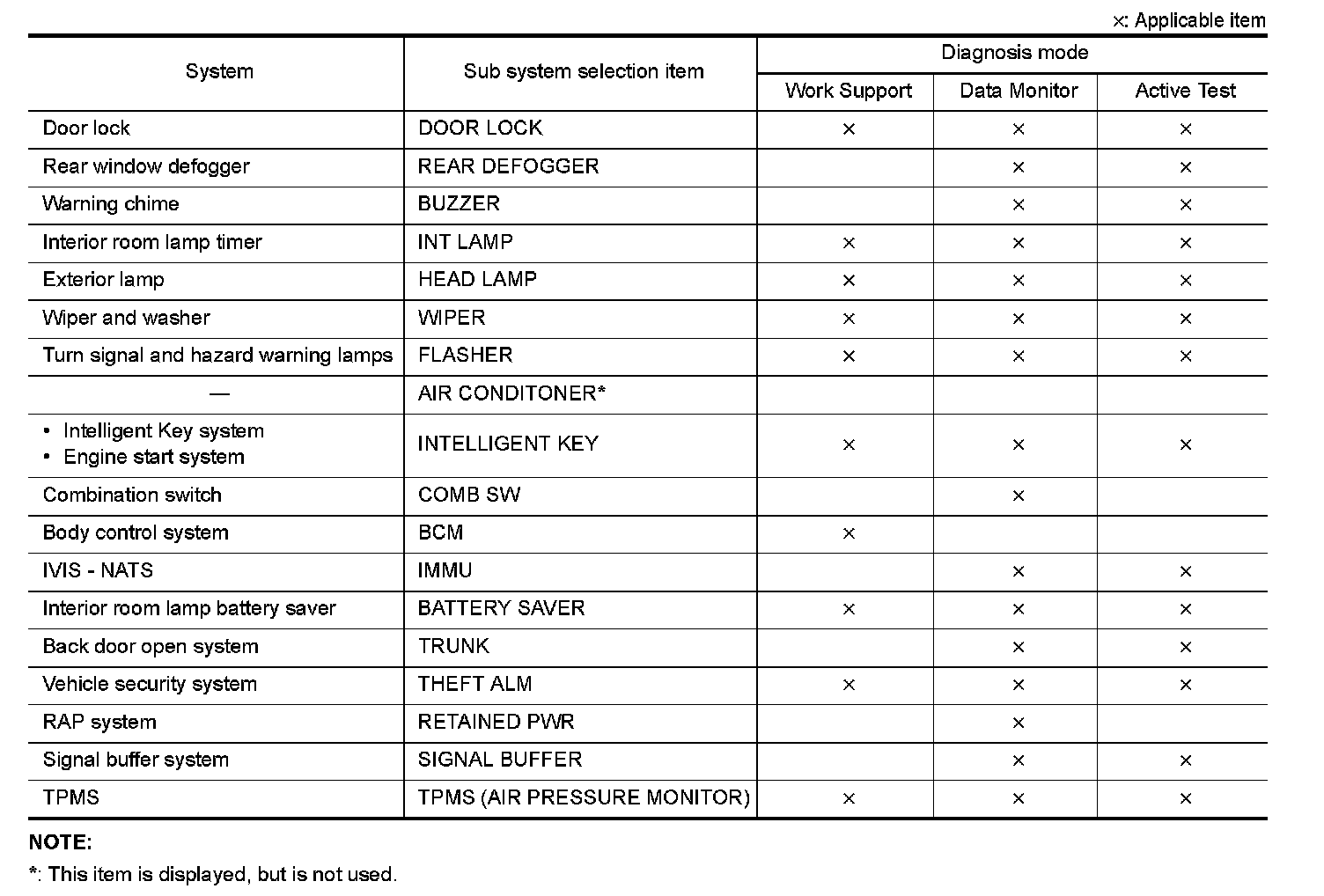 It can perform the diagnosis modes except the following for all sub system selection items.