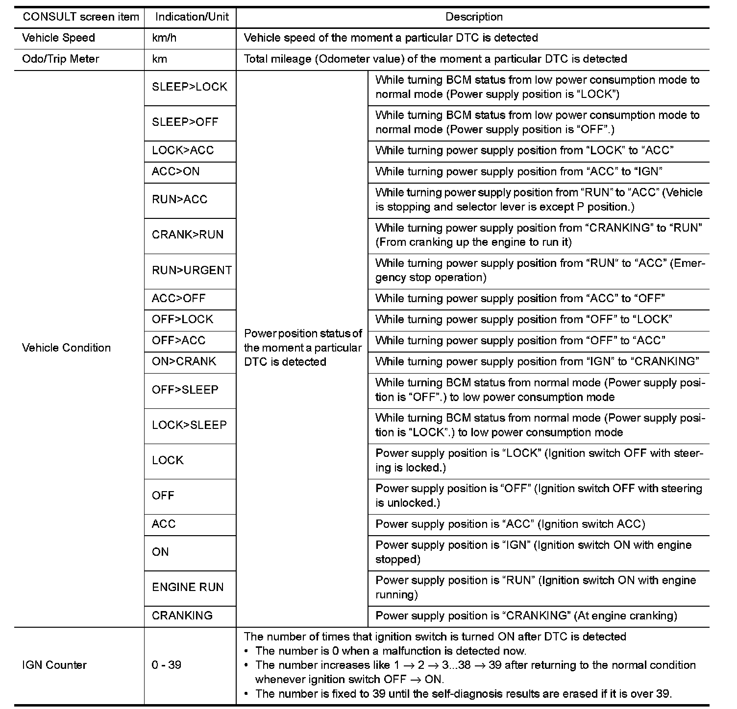 The BCM records the following vehicle condition at the time a particular DTC is detected, and displays on