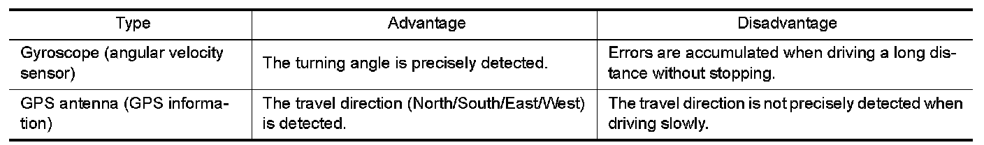 The gyroscope (angular velocity sensor) and GPS antenna (GPS information) detect a change in travel direction. Both have advantages and disadvantages as per the following descriptions.