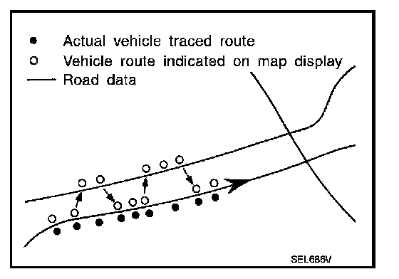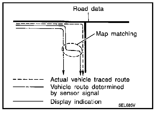 - Map-matching does not function correctly when road that the vehicle is driving on new, etc, or not recorded in the map data. Also, map-matching does not function correctly when road patterns stored in the map data and the actual road pattern are different due to repair, etc.
