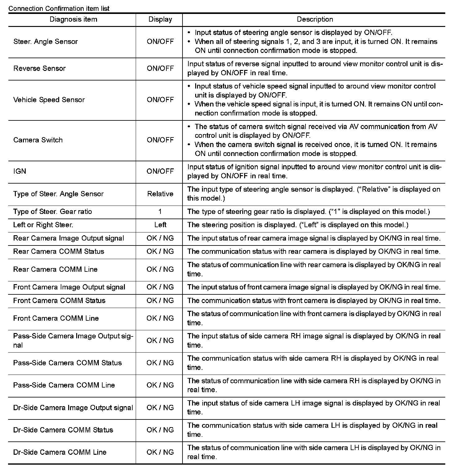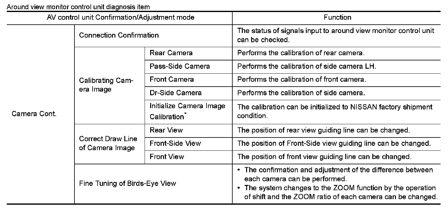 The diagnosis function of around view monitor control unit is displayed when selecting "Camera Cont." of Confirmation/Adjustment mode in the multi AV system.