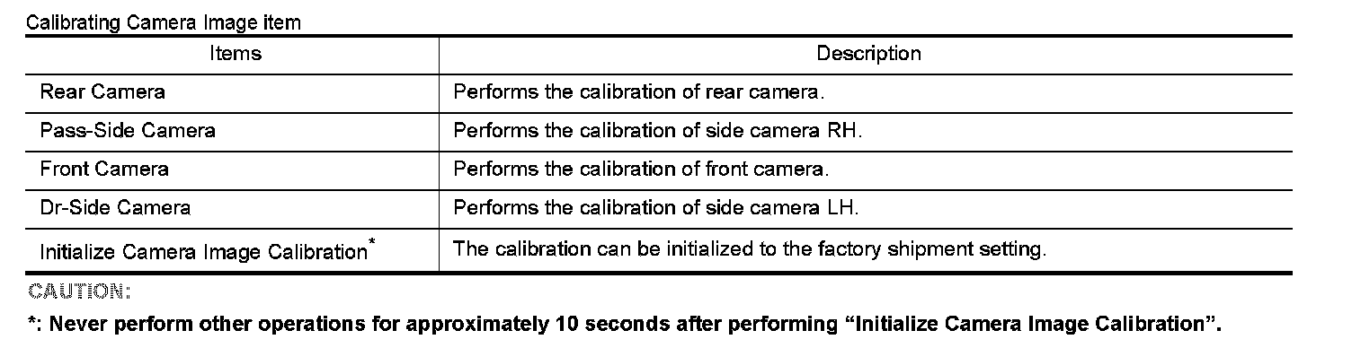 - Perform the calibration of camera image caused by the incorrect mounting position of each camera, etc. Always perform calibration after performing the following work.