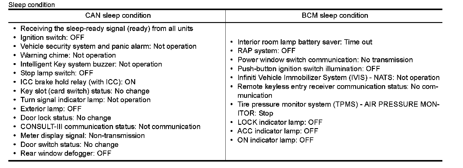 - BCM transmits the sleep wake up signal (sleep) to each unit when all of the CAN sleep conditions are fulfilled.