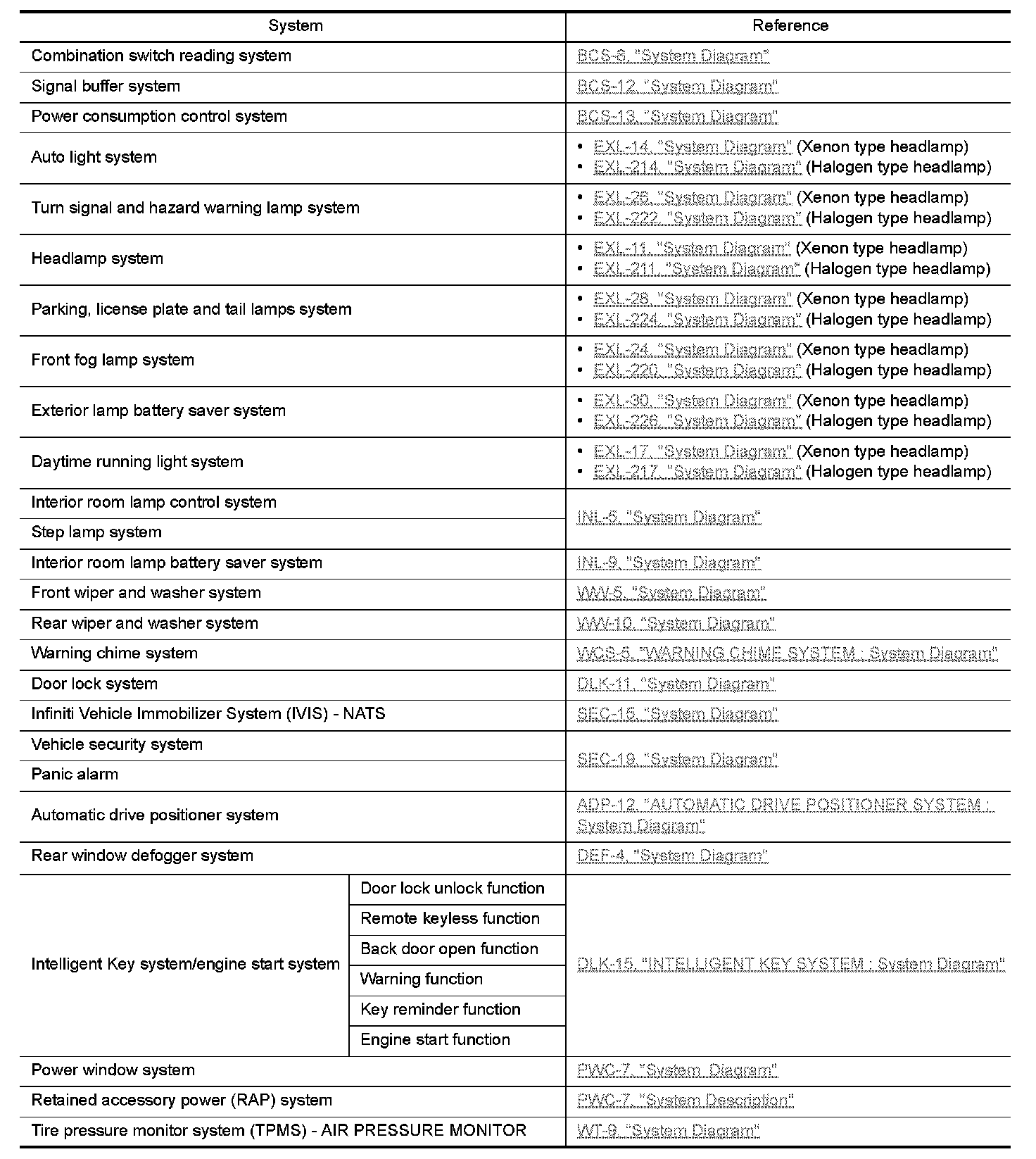 - BCM has combination switch reading function for reading the operation status of combination switches (light, turn signal, wiper and washer) in addition to a function for controlling the operation of various electrical components. It also has the signal transmission function as the passed point of signal and the power saving control function that reduces the power consumption with the ignition switch OFF.