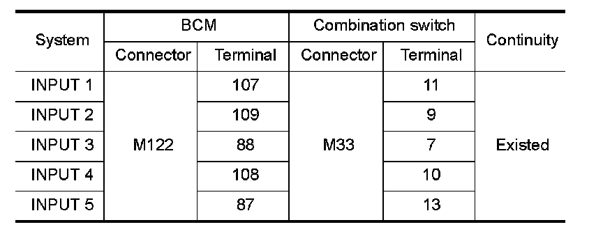 3. Check continuity between BCM harness connector and combination switch harness connector.