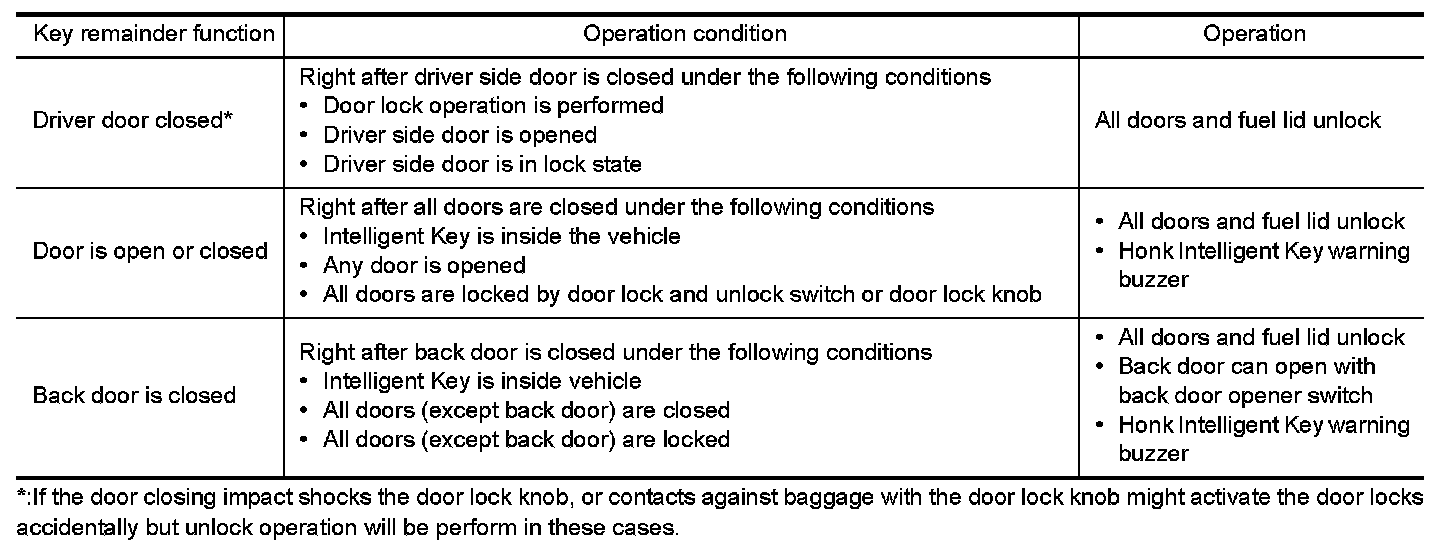 - Key reminder function is operated when the back door is open/closed and the buzzers sound, if the following operations are performed, the key reminder function is cleared and buzzer sounds are stopped.