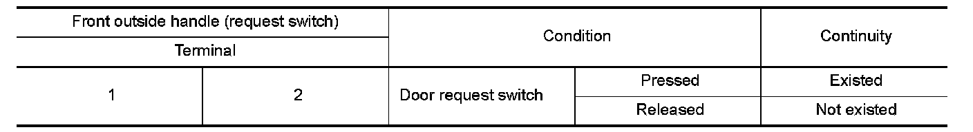 3. Check continuity between malfunctioning front outside handle (request switch) terminals.