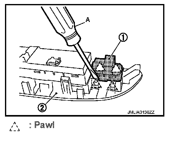 1. Remove the power window main switch finisher (2). Refer to Removal and Installation