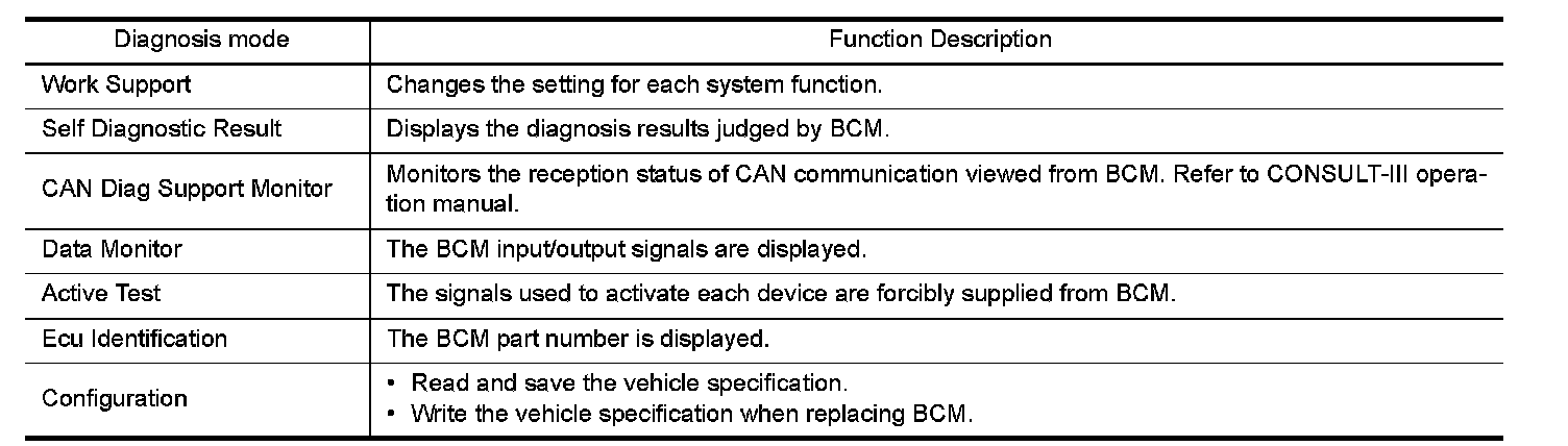 CONSULT-III performs the following functions via CAN communication with BCM.