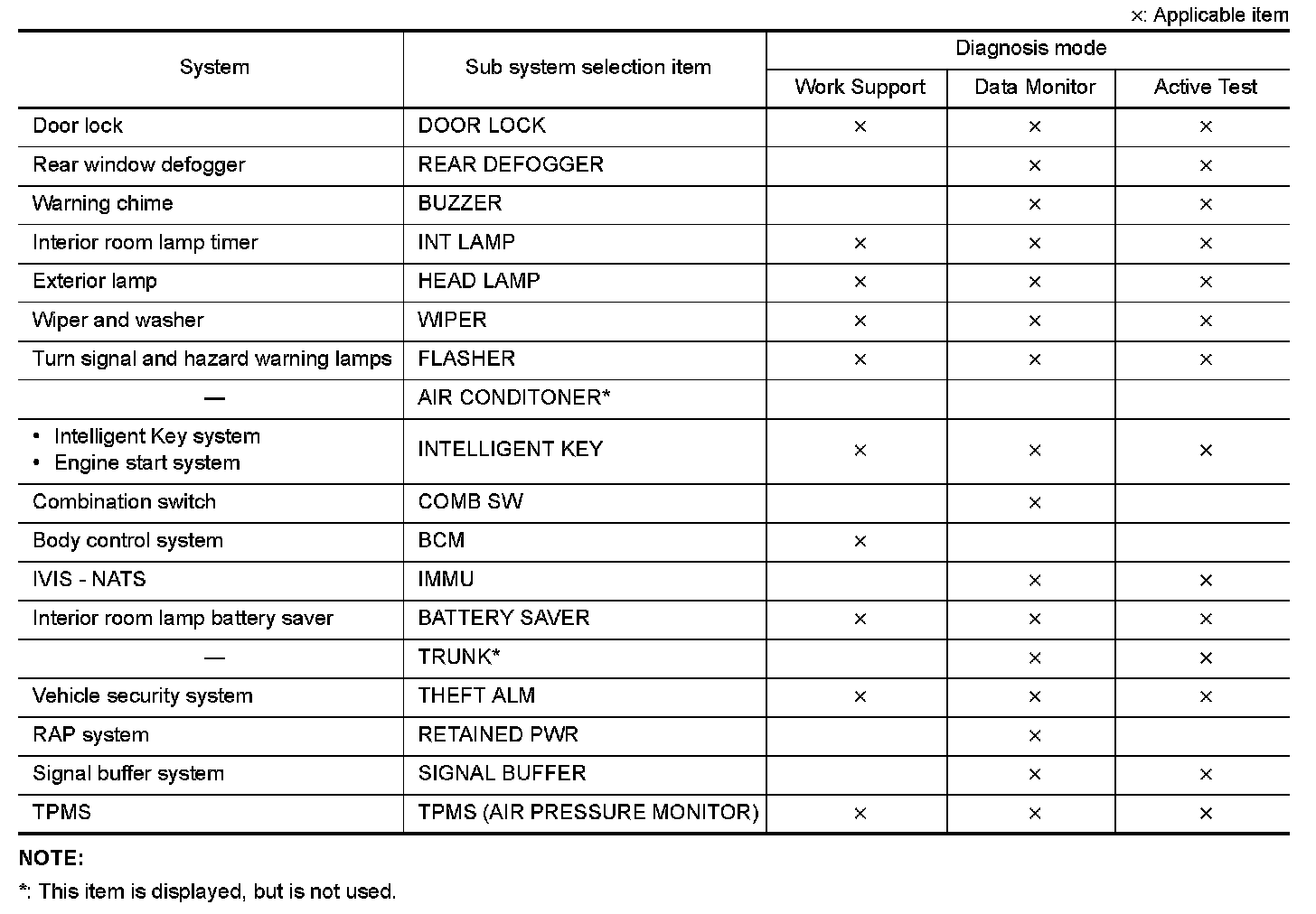 It can perform the diagnosis modes except the following for all sub system selection items.