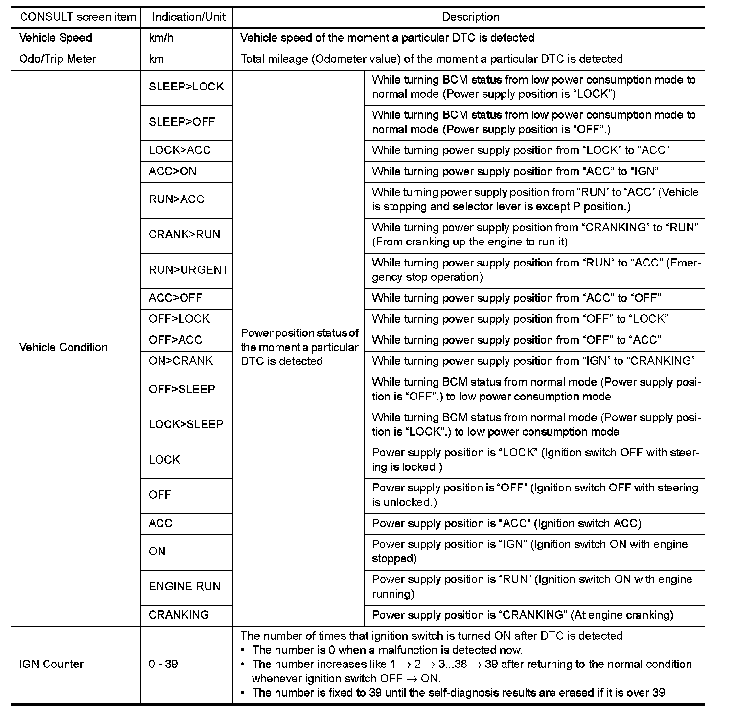 The BCM records the following vehicle condition at the time a particular DTC is detected, and displays on