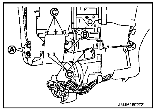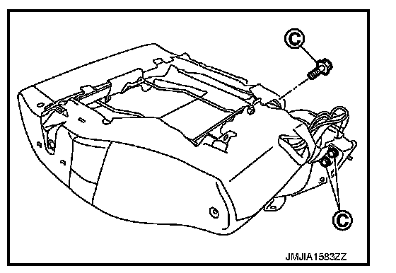 - Remove the arm rest mounting bolts (A), nuts (B) and hog rings (C), and then remove the armrest.