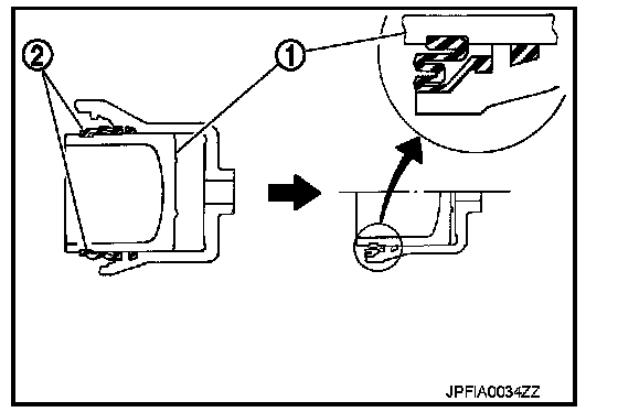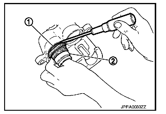 4. Apply brake fluid to pistons (1). Push piston into cylinder body by hand and push piston boot (2) piston-side lip into the piston groove.
