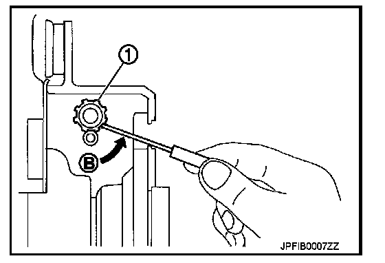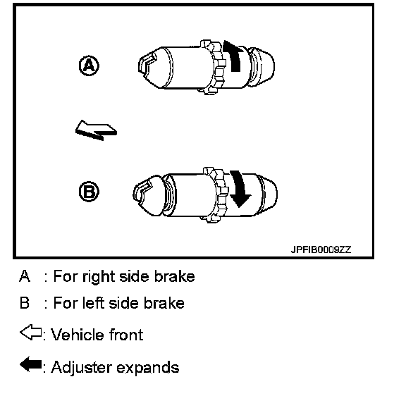 b. Using suitable tool, rotate adjuster (1) in direction (B) to retract and loosen brake shoe.