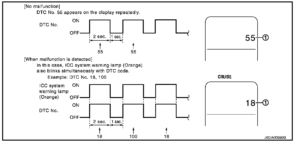4. The DTC is displayed on the set vehicle speed indicator (1) on the ICC system display on the information display when the on board self-diagnosis starts. Refer to Testing and Inspection.