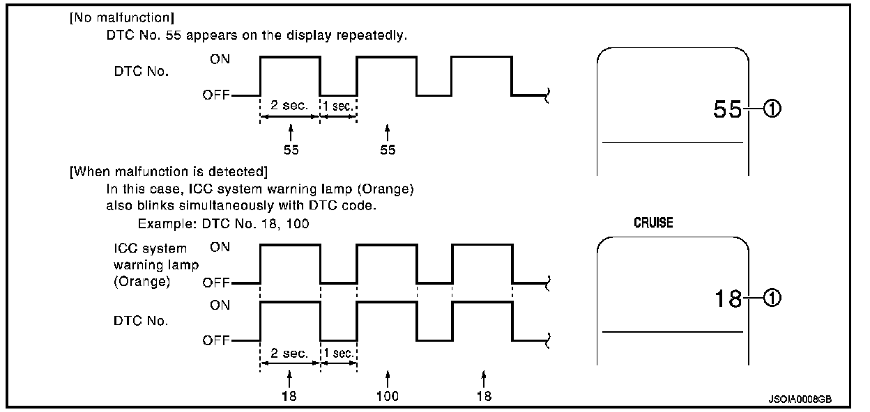 4. The DTC is displayed on the set vehicle speed indicator (1) on the ICC system display on the information display when the on board self-diagnosis starts. Refer to Testing and Inspection.