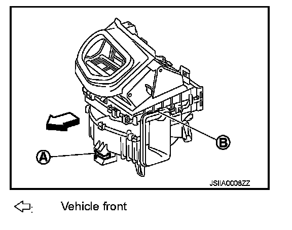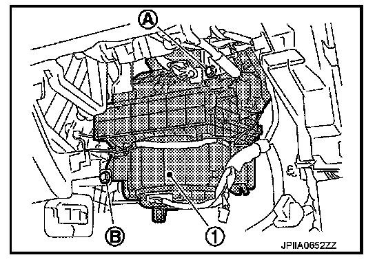 7. Remove mounting bolt (A) and screw (B), from blower unit (1).