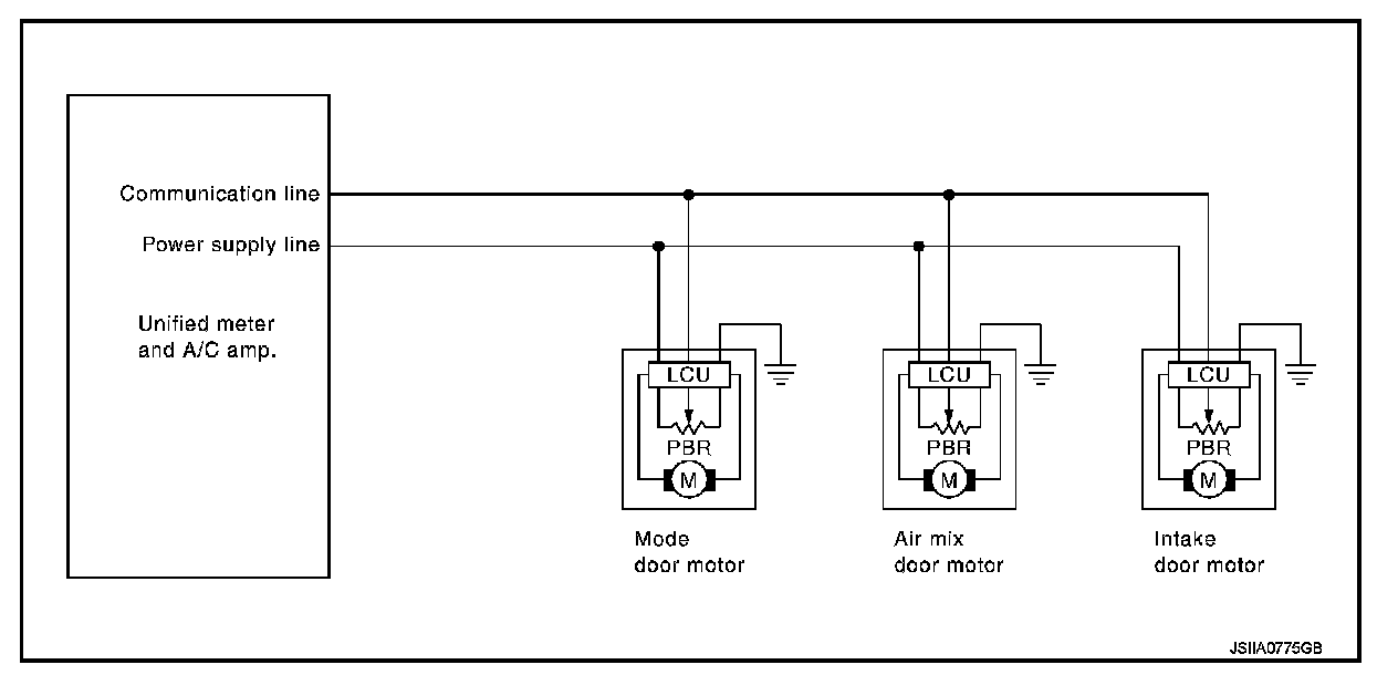- The air mix door motors, mode door motor and intake door motor read their respective signals according to the address signal. Opening angle indication signals received from the unified meter and A/C amp. and each of the motor position sensors are compared by the LCUs in each door motor with the existing decision and opening angles. Subsequently, HOT/COLD, DEF/VENT and FRE/REC operation is selected. The new selection data are returned to the unified meter and A/C amp.