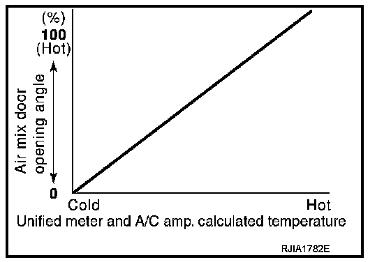 When ignition switch is ON, unified meter and A/C amp. continuously and automatically controls temperatures regardless of air conditioner operational condition. When setting a target temperature with temperature control dial, unified meter and A/C amp. corrects the set temperature and decides a target air mix door opening angle. Unified meter and A/C amp. controls air mix door according to the target air mix door opening angle and current air mix door opening angle for keeping an optimum air mix door opening angle. When a temperature is set at 18�C (60�F), air mix door is fixed at full cold, and when a temperature is set at 32�C (90�F), it is set at full hot.