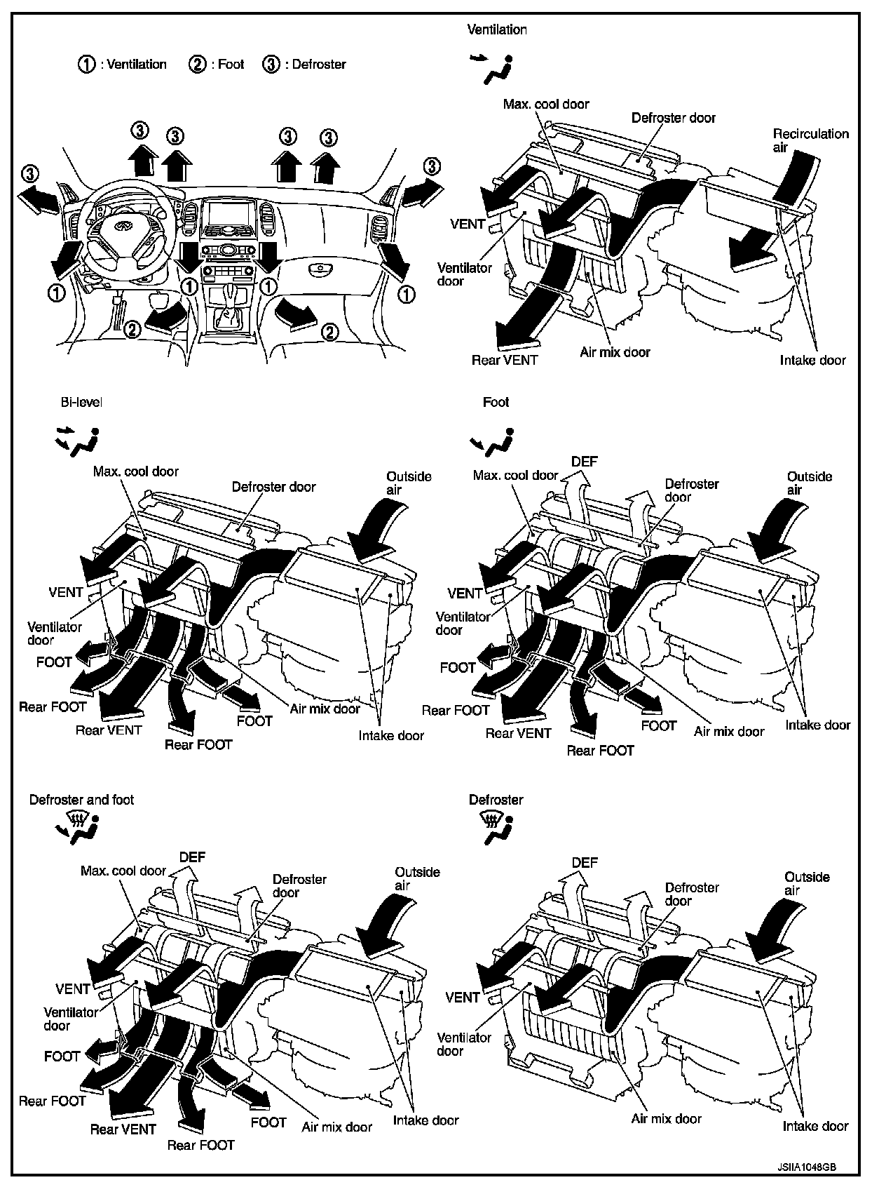 - The compressor, intake doors, air mix doors, mode doors and blower speed are automatically controlled so that the in-vehicle temperature will reach, and be maintained at the set temperature selected by the operator.