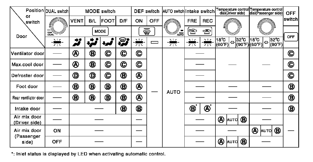 - Data sent from the unified meter and A/C amp. are selected according to data-based decisions made by the mode door motor, air mix door motors and intake door motor.