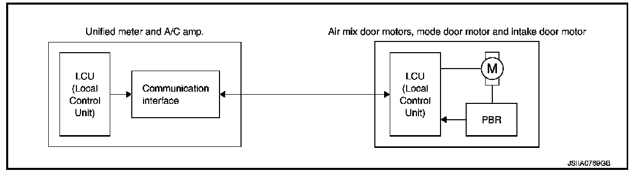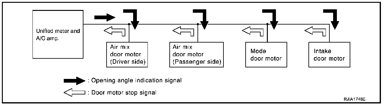 The mode door motor, air mix door motors and intake door motor read their respective signals according to the address signal. Opening angle indication signals received from the unified meter and A/C amp. and each of the motor position sensors is compared by the LCUs in each door motor with the existing decision and opening angles. Subsequently, HOT/COLD, DEF/VENT and FRE/REC operation is selected. The new selection data is returned to the unified meter and A/C amp.