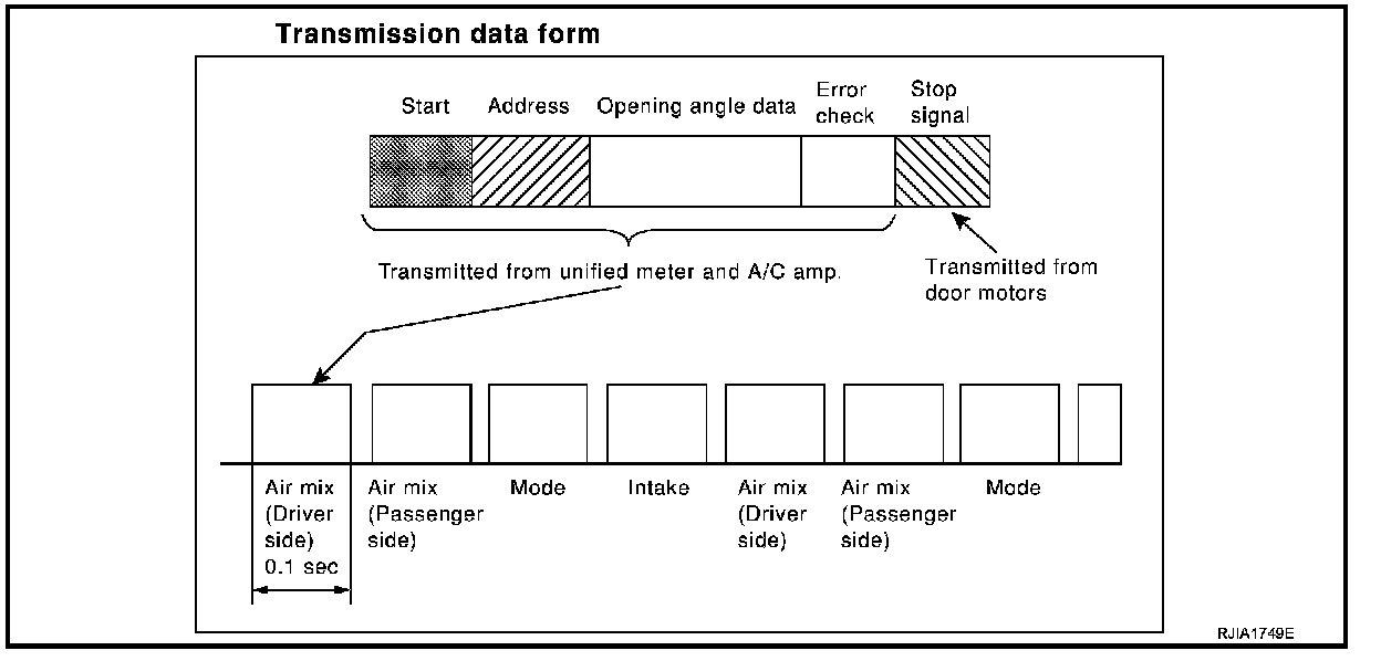 Addresses, motor opening angle signals, motor stop signals and error checking messages are all transmitted through the data transmission lines connecting the unified meter and A/C amp. and each door motor.