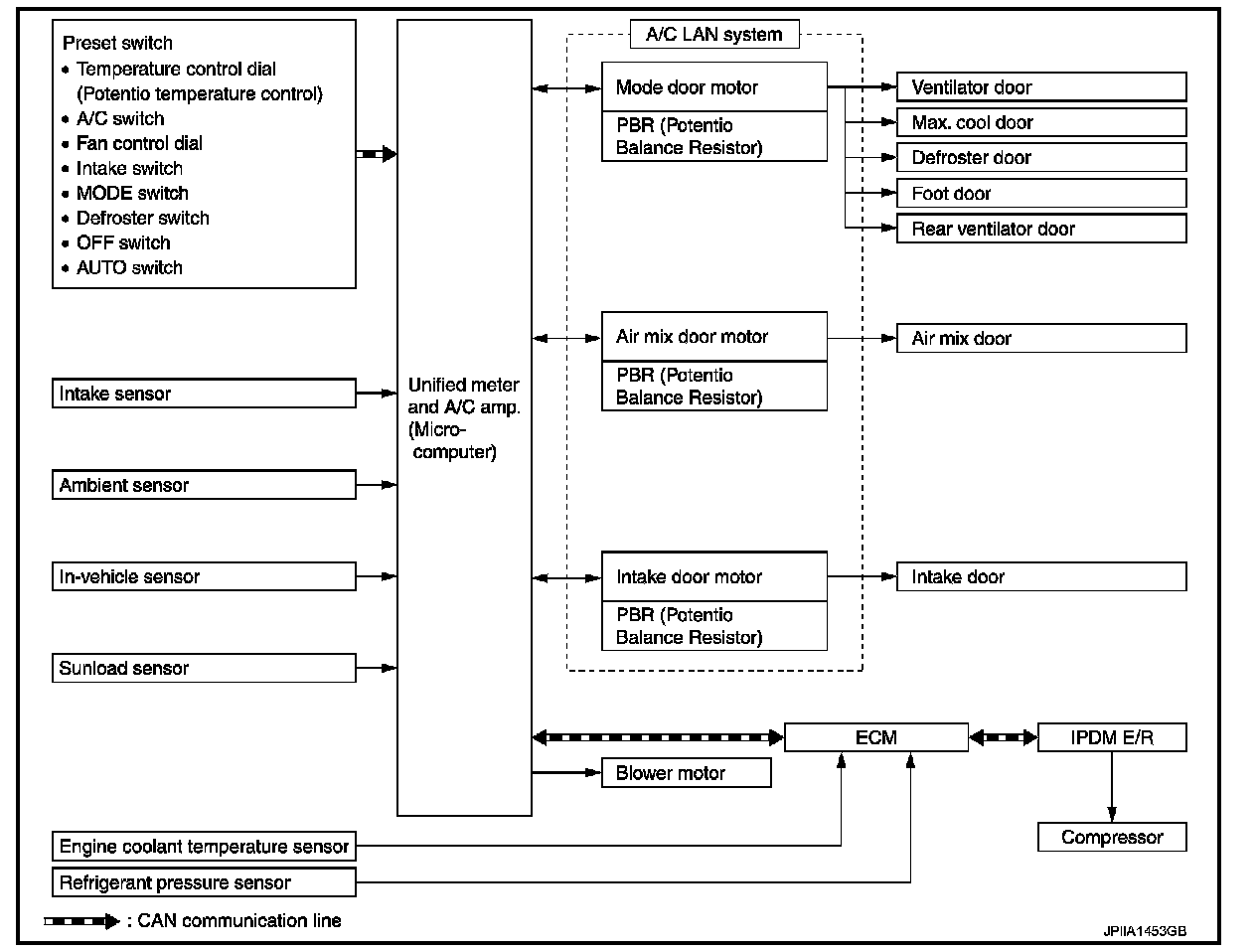 The control system consists of input sensors, switches, unified meter and A/C amp. (microcomputer) and outputs. The relationship of these components is as shown in the figure below: