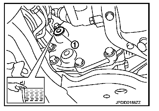 - Remove filler plug (1) and check oil level from filler plug mounting hole as shown in the figure.