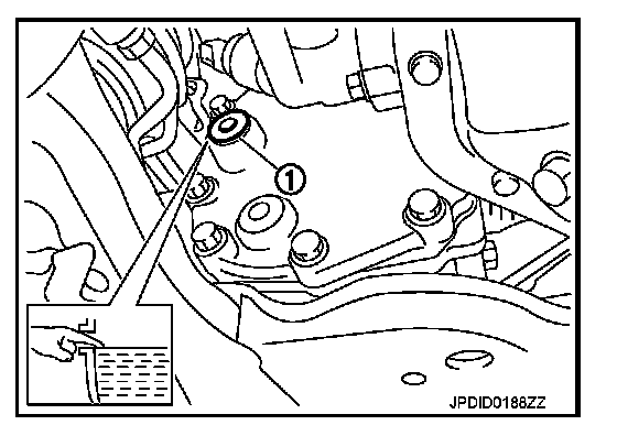 1. Remove filler plug (1). Fill with new gear oil until oil level reaches the specified level near filler plug mounting hole.