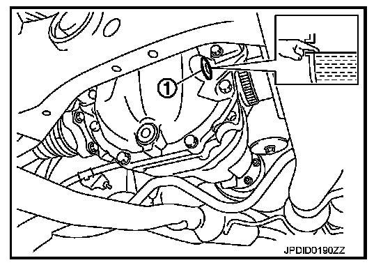 - Remove filler plug (1) and check oil level from filler plug mounting hole as shown in the figure.