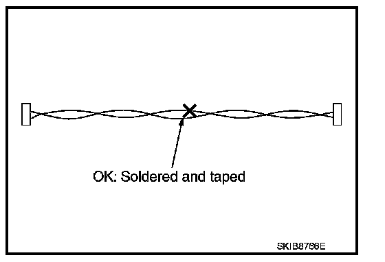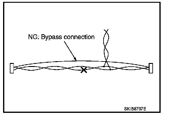 Bypass connection may cause CAN communication and ITS communication error. The spliced wire becomes separated and the characteristics of twisted line are lost.