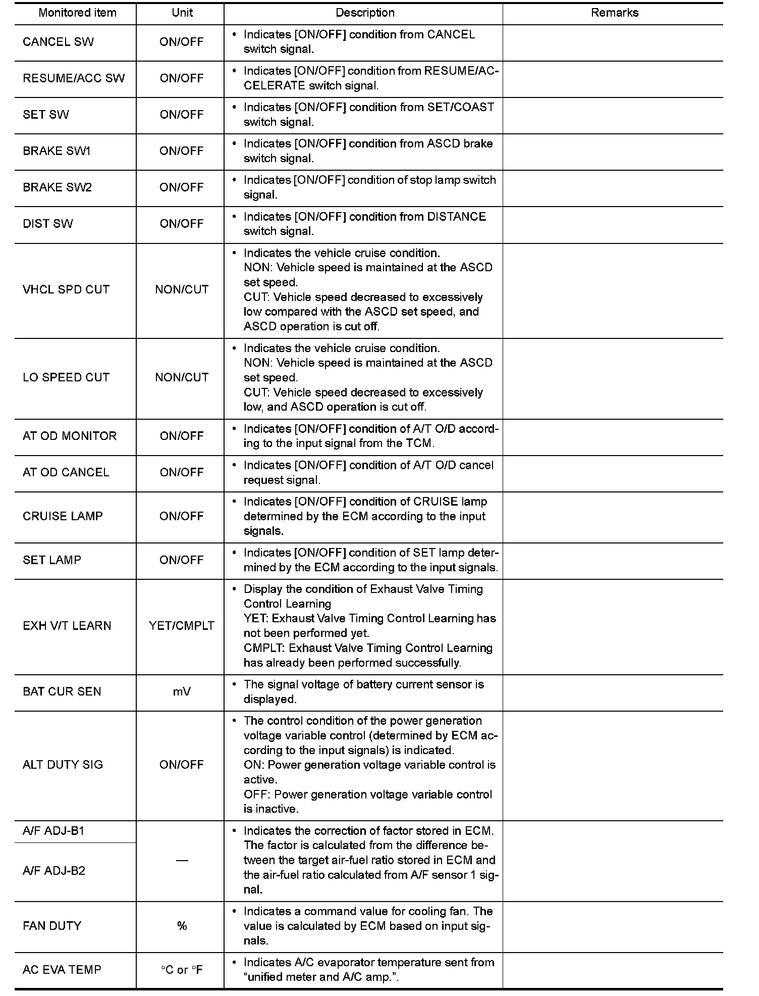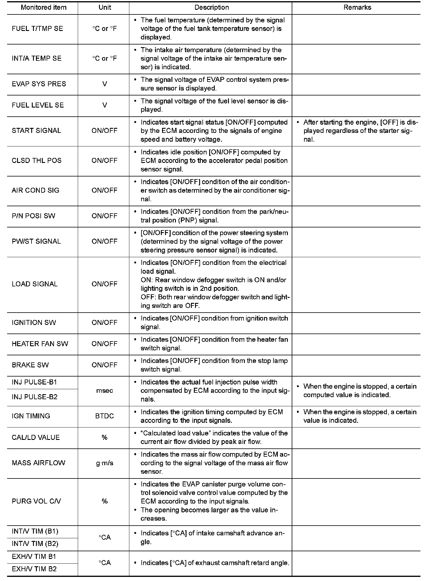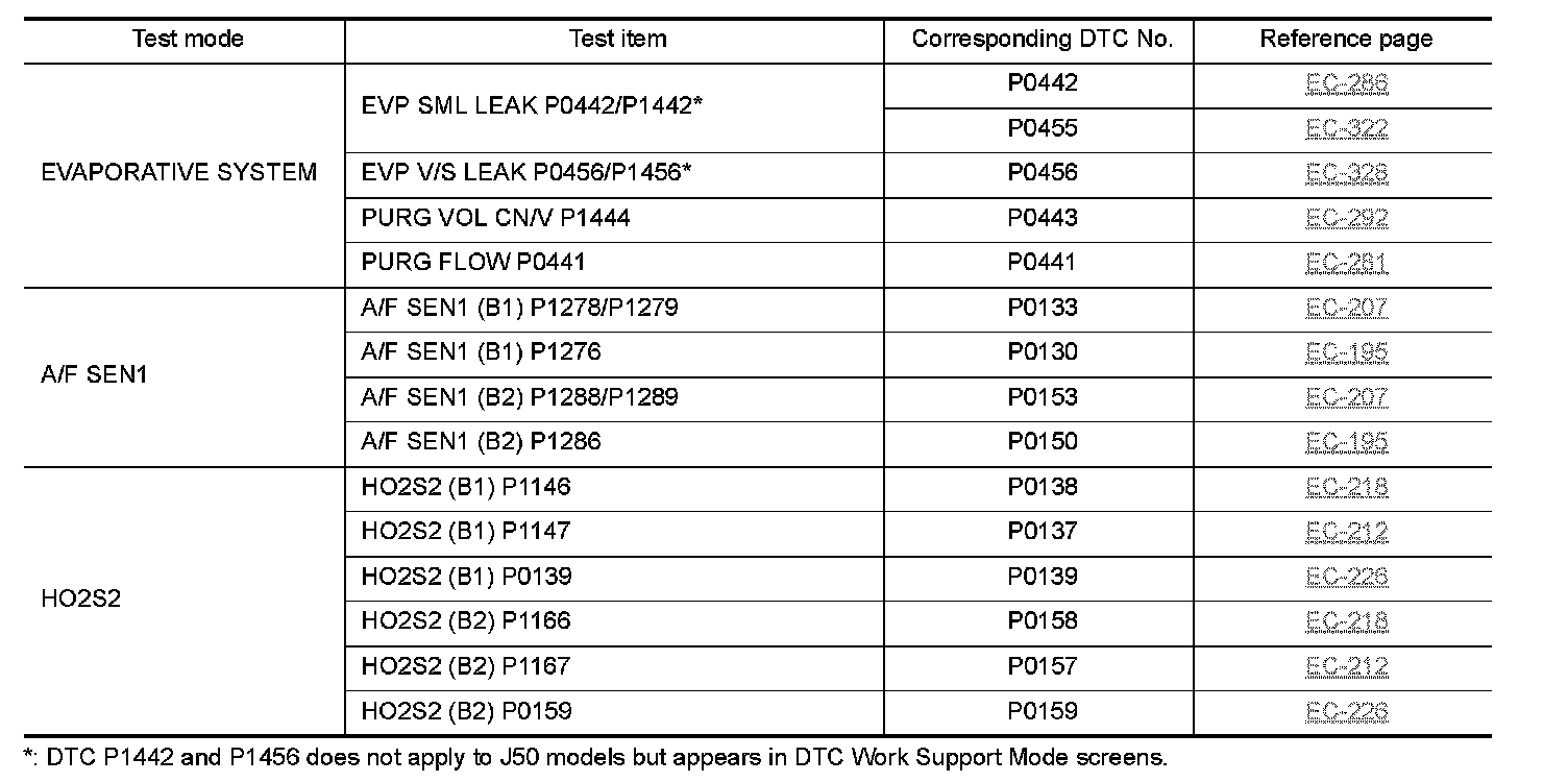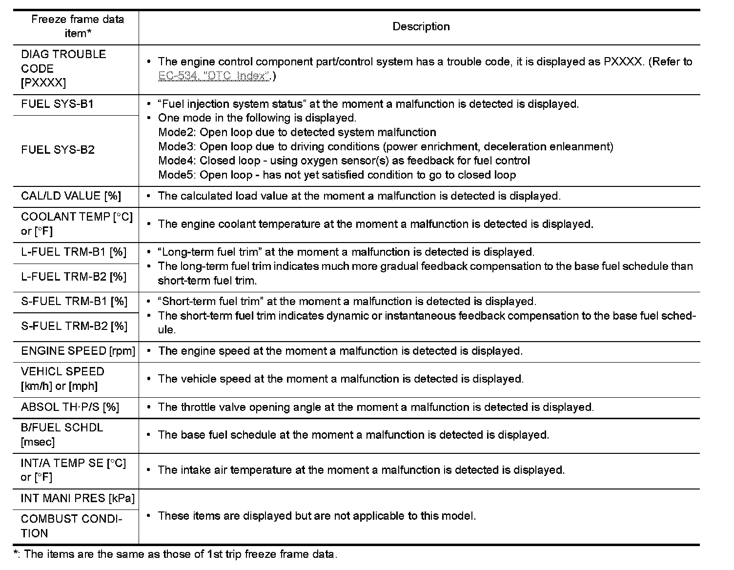 Regarding items of DTC and 1st trip DTC, refer to Testing and Inspection.