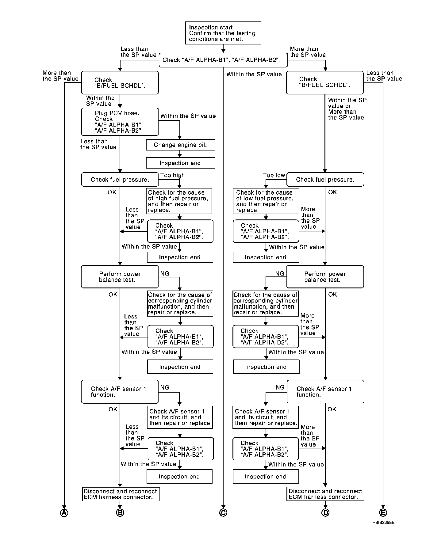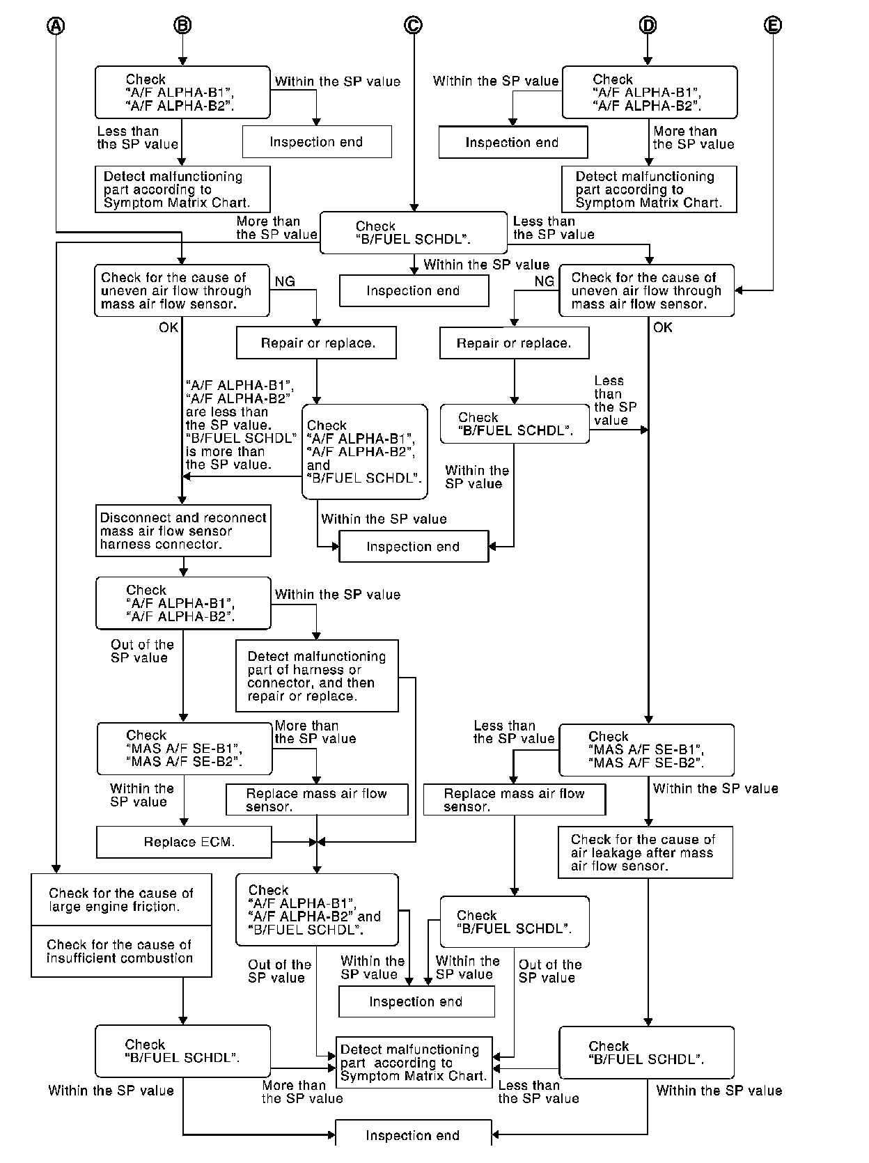 Select "A/F ALPHA-B1", "A/F ALPHA-B2", and "B/FUEL SCHDL" in "SPEC" of "DATA MONITOR" mode, and check that the each indication is within the SP value.