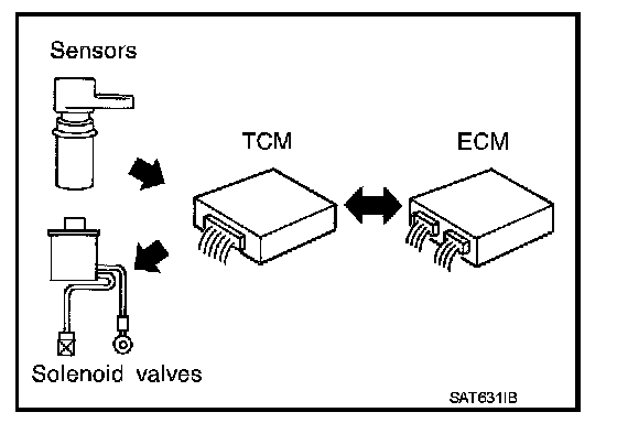 The TCM also communicates with the ECM by means of a signal transmitted from sensing elements used with the OBD-related parts of the A/T system for malfunction-diagnostic purposes. The TCM is capable of diagnosing malfunctioning parts while the ECM can store malfunctions in its memory.