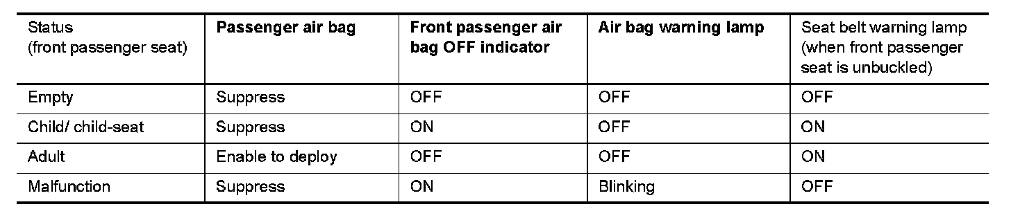 1. Suppress the deployment of front passenger air bag when front passenger seat is empty, or when occupied by child and child-seat. Turns ON front passenger air bag OFF indicator when front passenger seat is occupied by child-seat and child.