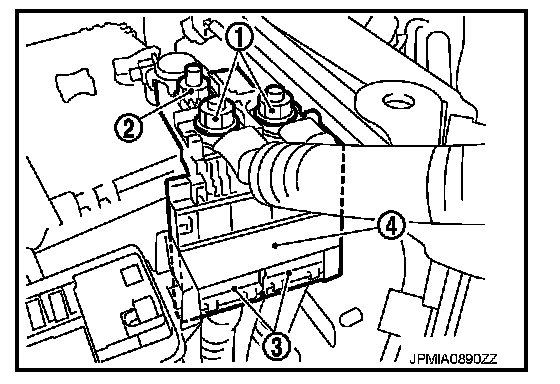 5. Disconnect harness connector (3) and remove battery terminal with fusible link (4).