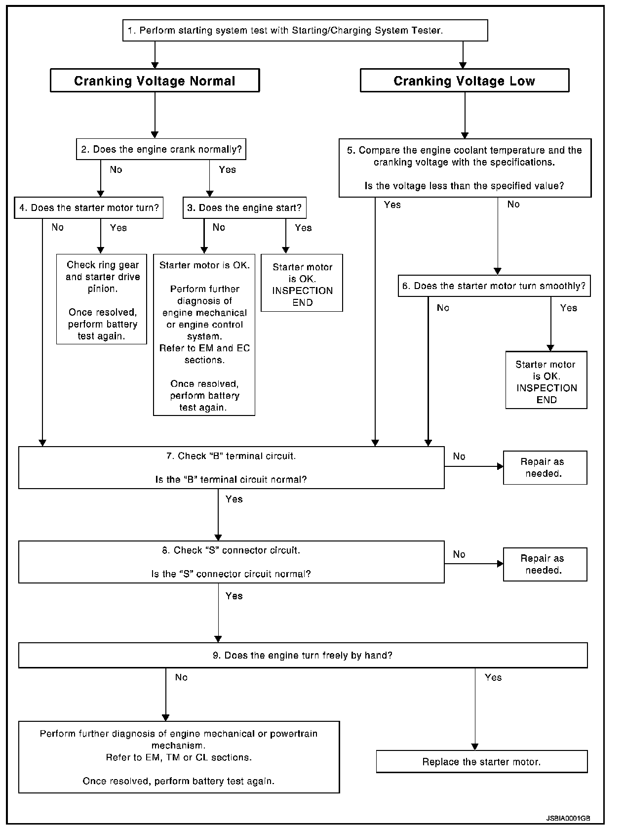 NO - Starter motor is OK. Perform further diagnosis of engine mechanical or engine control system.