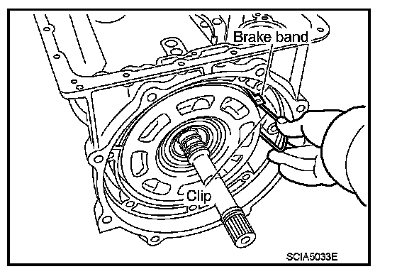 48. Adjust brake band tilting using a clip so that brake band contacts front sun gear drum evenly.