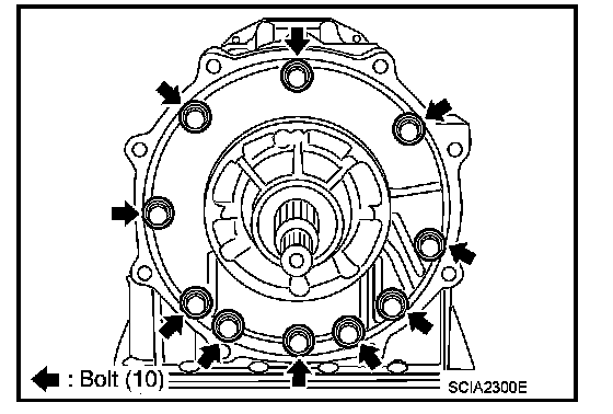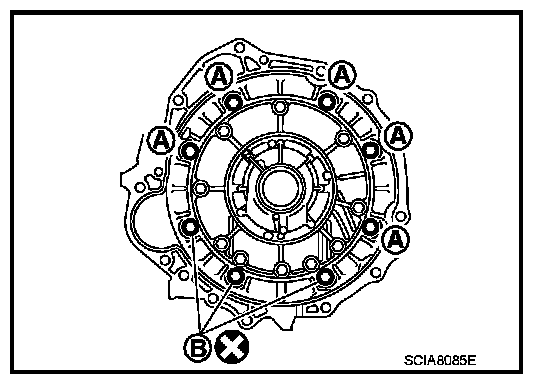 57. Install converter housing to transmission case, and then tighten converter housing bolts (A) and self-sealing bolt (B) to the specified torque.