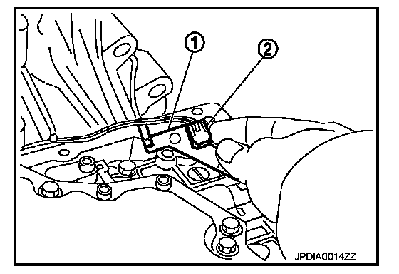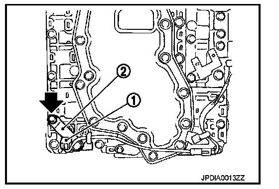 64. Install A/T fluid temperature sensor 2 (1) [with bracket (2)] to control valve with TCM. Tighten A/T fluid temperature sensor 2 bolt to the specified torque.